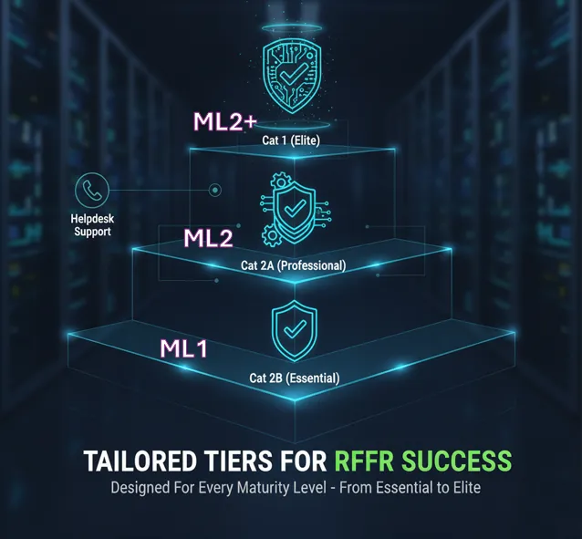 Cyber Assured MSP offers tiered RFFR Packages that combine RFFR documentation, implementation and helpdesk support. These packages are designed to suit businesses of varying sizes and maturity levels. Each package includes tailored documentation, hands-on implementation support, and compliance tracking to streamline your RFFR journey.